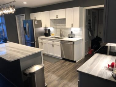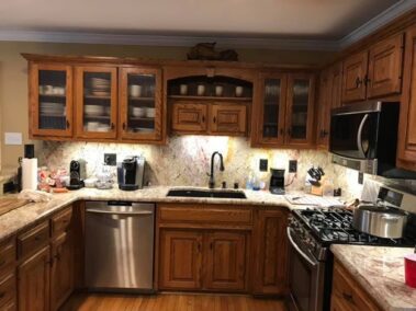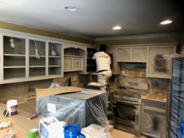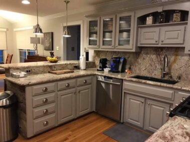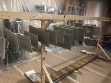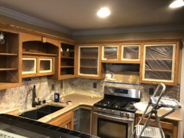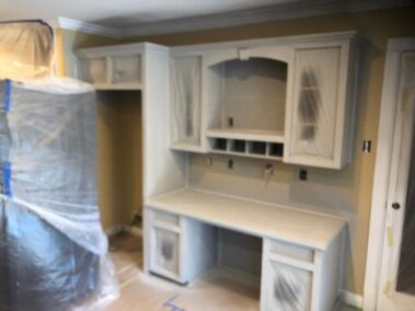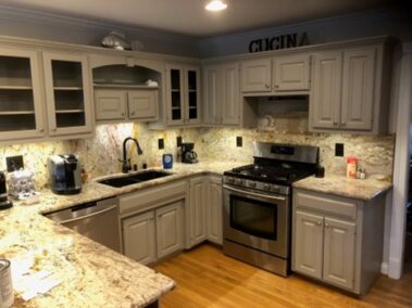 We will refinish or paint your kitchen, bathroom, or pantry cabinets the right way, so they won’t chip or peel later. We will sand off the slick, polyurethane finish (if not previously painted), prime with an oil-based primer (the essential step which many skip, and which is why cabinets chip and peel in the years to come), then apply a very high-grade paint finish (Sherwin Williams’ Emerald Urethane Trim Enamel or their new Gallery Series designed especially for Cabinetry and may not require a primer, depending on the existing finish on your cabinets – saving you money) so you can have the cabinet color you desire to update your outdated stained or previously painted cabinets.