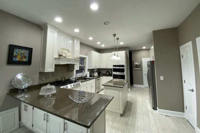 Chris and Mindy asked us to do a complete remodel of their existing kitchen and small living room and entry by removing the walls between each area to make one grand great room.